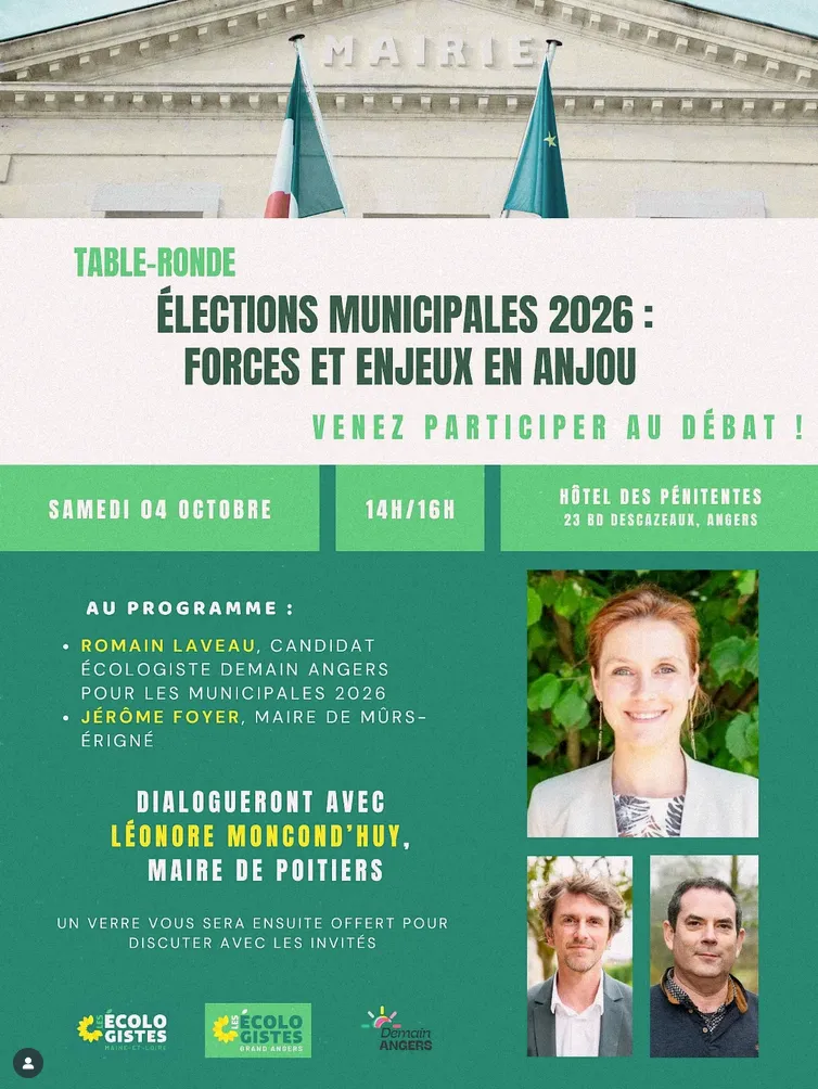 La table ronde sur les élections municipales a rencontré un beau succès le samedi 4 octobre à Angers. Organisé par la Coordination départementale du Maine-et-Loire, en lien avec le Groupe local Grand Angers et Demain Angers (Union de la gauche sur Angers pour les élections municipales 2026), cet événement était intitulé « Préparer l'écologie de demain en Anjou » a amené à de riches et inspirants échanges entre Romain Laveau, tête de liste de Demain Angers, Jérôme Foyer, maire de Mûrs-Érigné et Léonore Moncond'huy, maire de Poitiers.