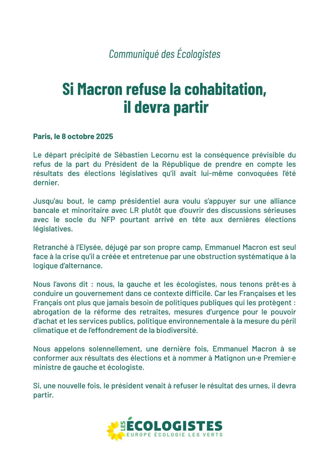 Suite à la mission flash de Sébastien Lecornu, qui aura le mérite d'avoir réussi à durer un peu plus longtemps que son gouvernement, Matignon et l'Élysée ont annoncé mercredi soir pouvoir proposer un nouveau premier ministre dans un délai de 48 heures. Pour Les Écologistes, la donne est claire, et elle est résumée dans le communiqué ci-dessous :